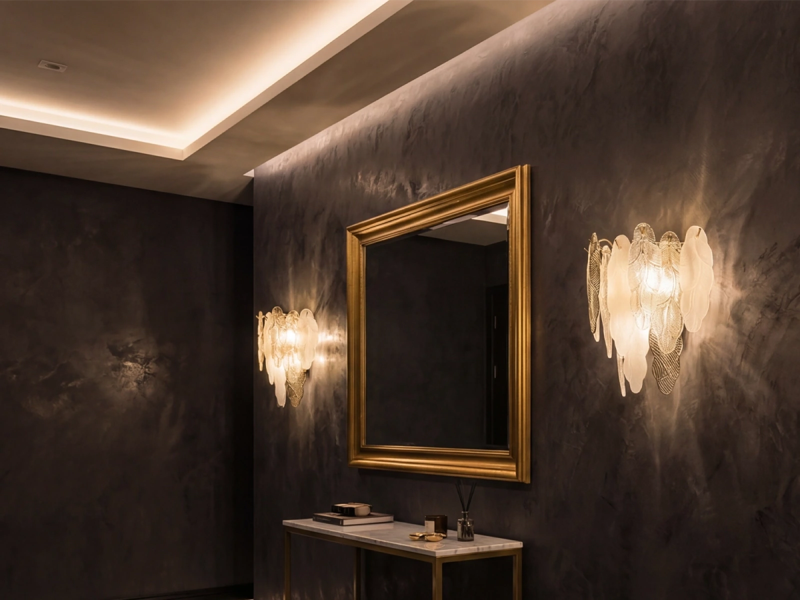 La struttura raffinata degli elementi in vetro combinata con dettagli decorativi in metallo sottolinea il carattere lussuoso e sofisticato di questa collezione.