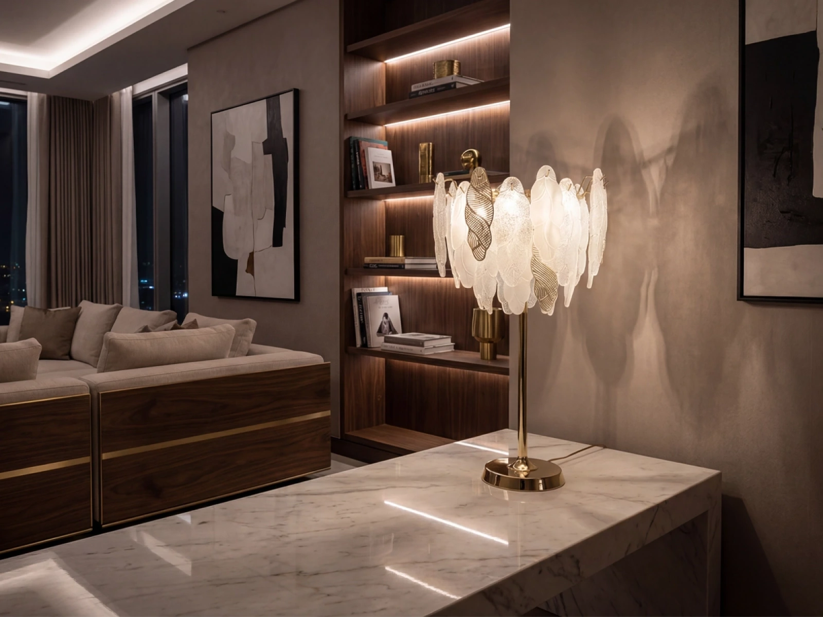 La lampada da tavolo CHOREO di VIZARDI è un'elegante illuminazione di design con un carattere decorativo distintivo. La precisa disposizione dei singoli elementi crea una composizione armoniosa con un effetto luminoso unico e aggiunge un accento visivo distintivo allo spazio. L'apparecchio è adatto a soggiorni, sale da pranzo, camere da letto e interni di rappresentanza.