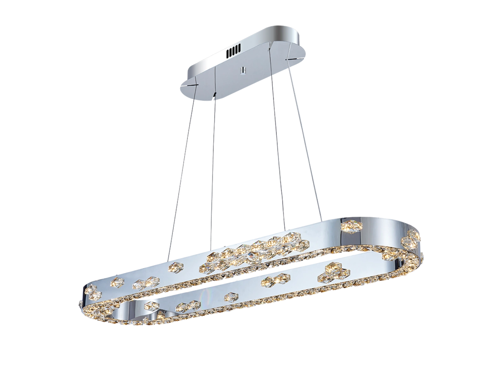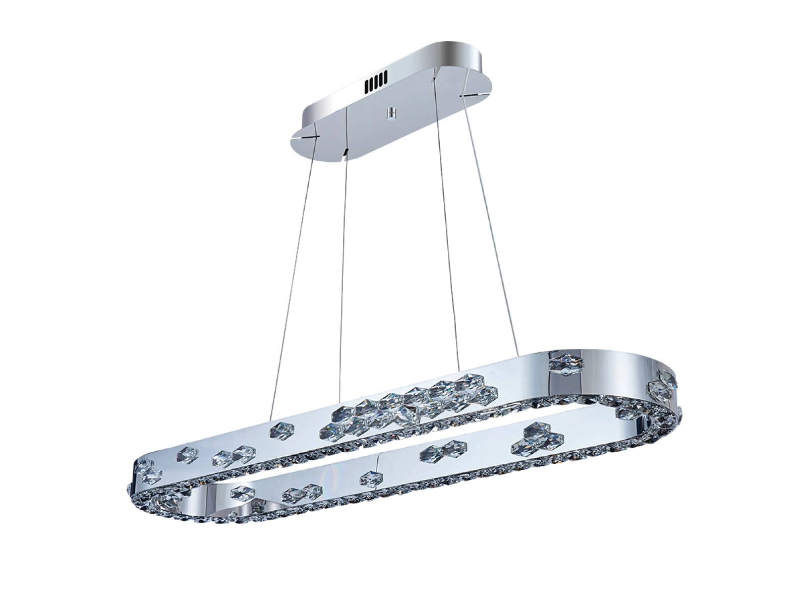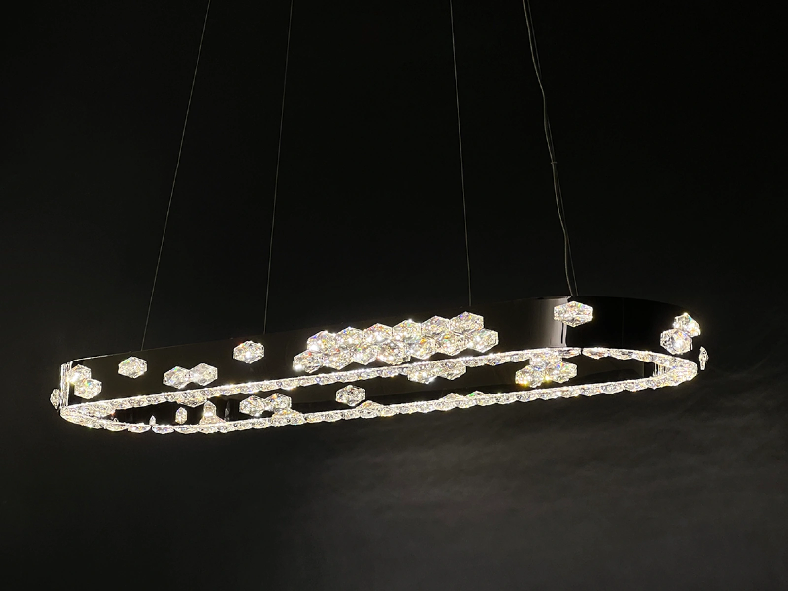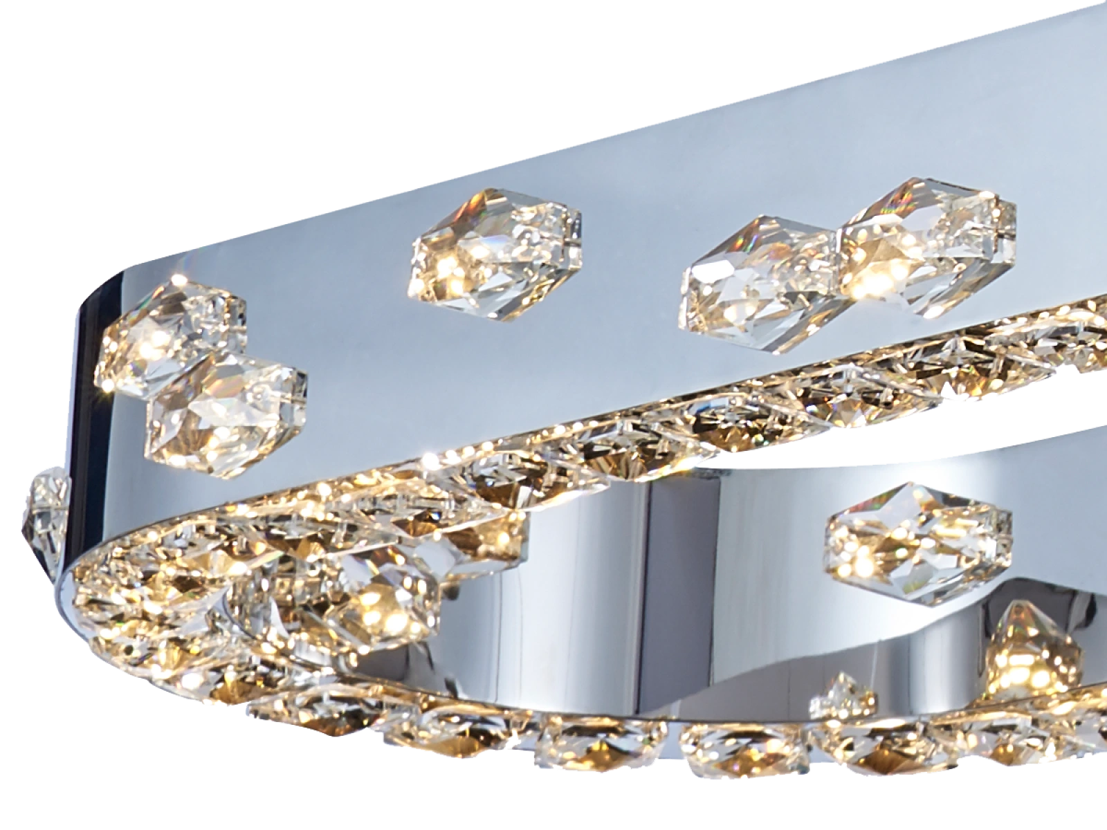 L'apparecchio è realizzato in resistente metallo di acciaio inossidabile con finitura cromata, mentre il suo design è completato da cristalli tagliati con precisione per favorire la riflessione e la rifrazione della luce. La tecnologia di lavorazione garantisce la stabilità del materiale e la conservazione delle proprietà estetiche.