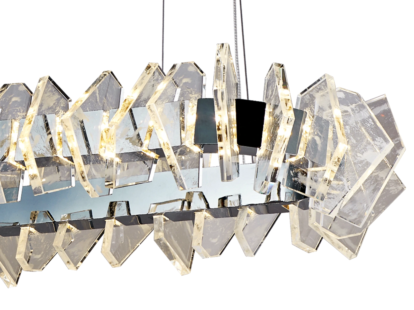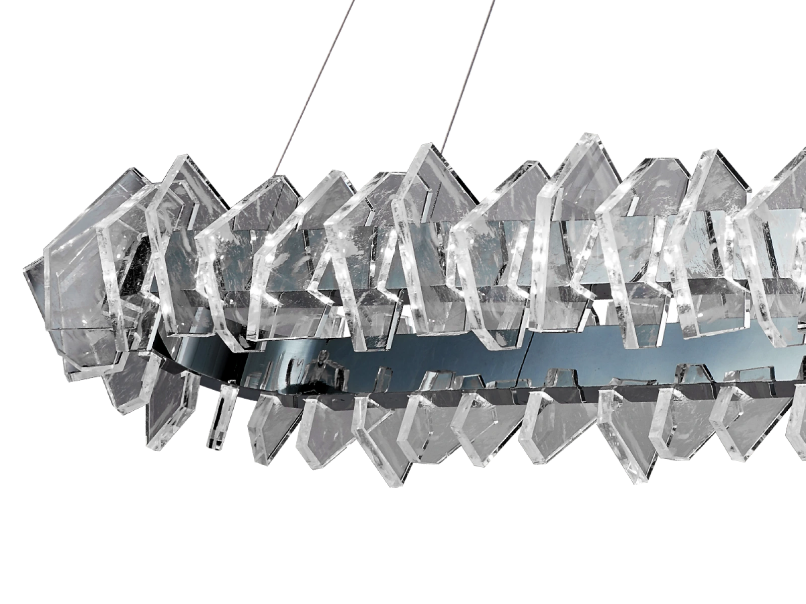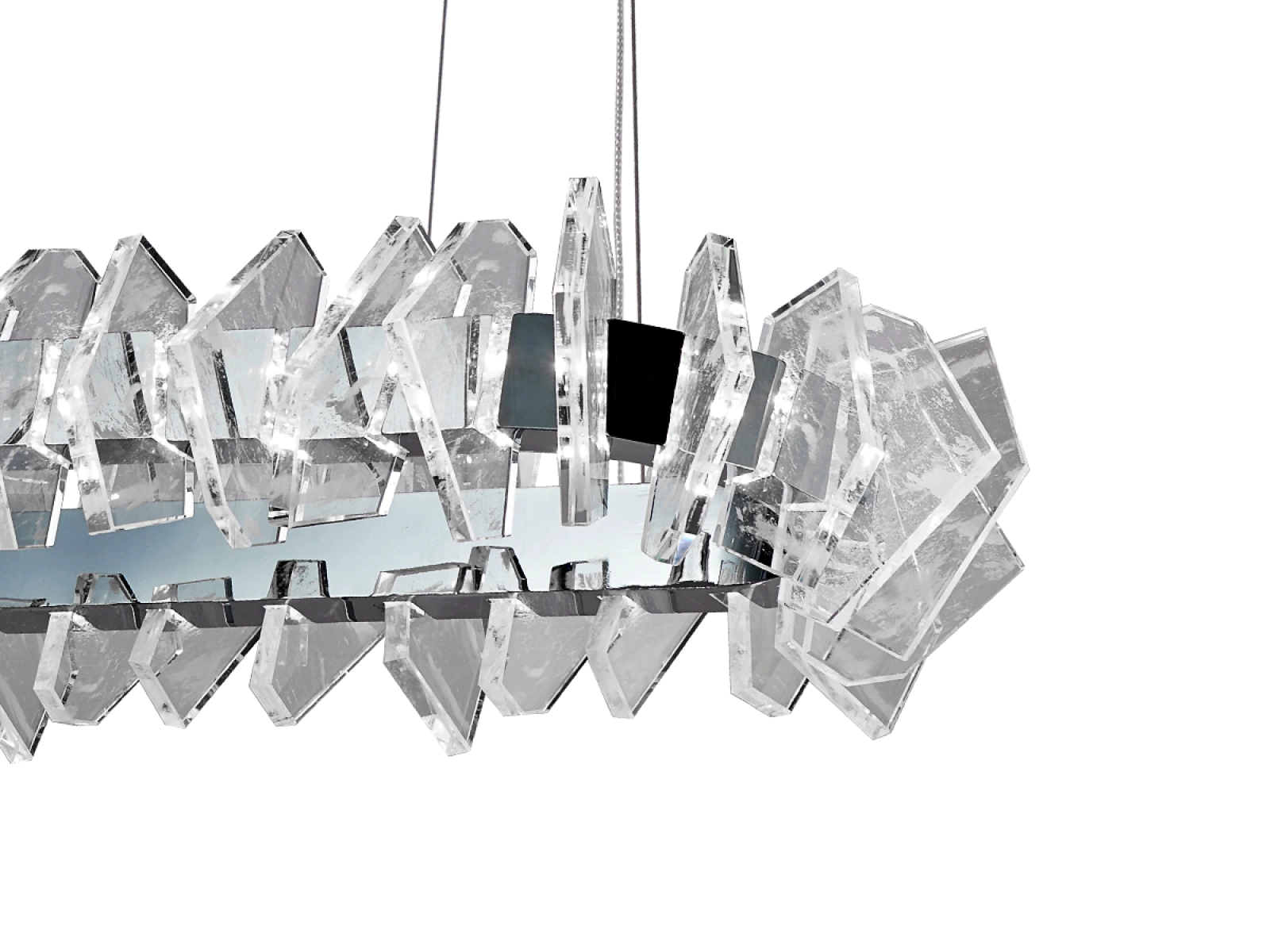 La struttura è realizzata in acciaio di alta qualità con finitura cromata e completata da originali elementi in cristallo tagliati con precisione che garantiscono un'intensa rifrazione e riflessione della luce. Il risultato è un ambiente luminoso di lusso con un effetto decorativo distintivo che sottolineerà il carattere di interni moderni e rappresentativi.